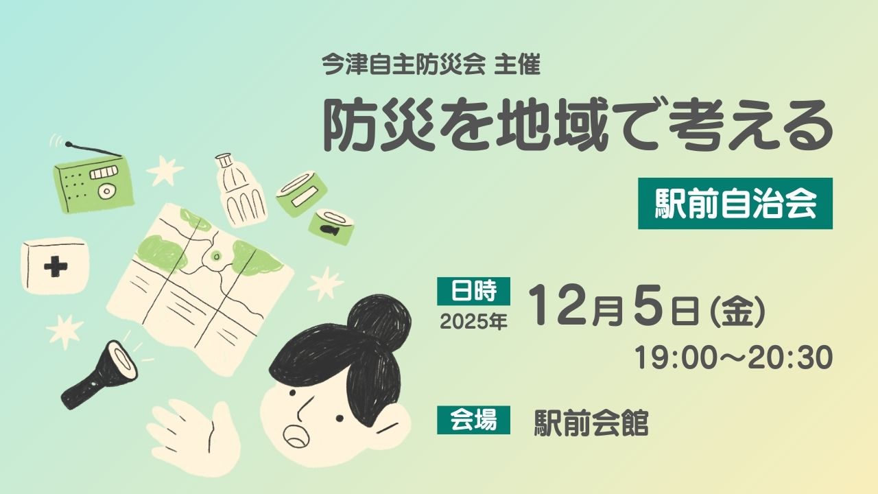 今津自主防災会主催の住民防災学習「防災を地域で考える」駅前自治会にて、防災DVD鑑賞後、防災についてのお話をさせて頂きます。