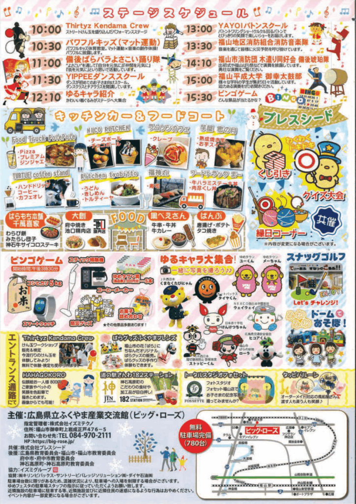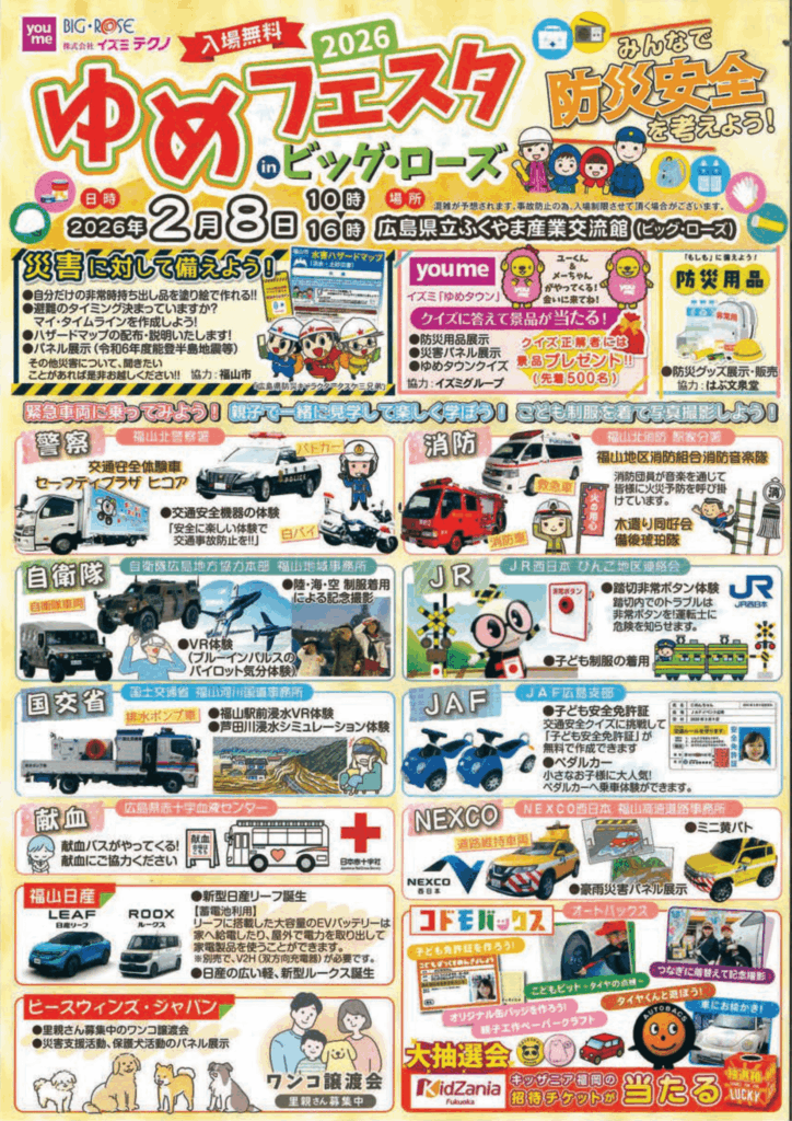 2026年2月8日 ゆめフェスタ in ビッグ・ローズ ~みんなで防災・安全を考えよう!~ 開催済みイベント 2026.01.272026.01.28 毎年ビッグローズで開催されている 親子で防災を楽しく学ぶイベント ゆめフェスタ が今年も開催されます。 日時:2026年2月8日(日) 10:00 ~ 16:00会場:広島県立ふくやま産業会館(ビッグ・ローズ) 2026 ゆめフェスタ in ビッグ・ローズ ~みんなで防災・安全を考えよう!~ - 福山ビッグ・ローズ – 広島県立ふくやま産業交流館 広島 福山でのイベントは福山ビッグ・ローズで開場時間 10:00 閉場時間 16:00 詳しくはこちら ゆめフェスタチラシ表 ゆめフェスタチ