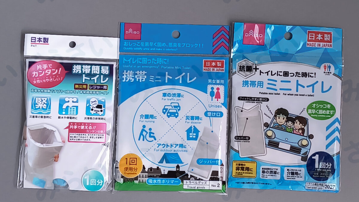 今や100円均一でも防災グッズを揃えることが出来ます。今回はダイソーの携帯トイレ3種類を比較してみました。